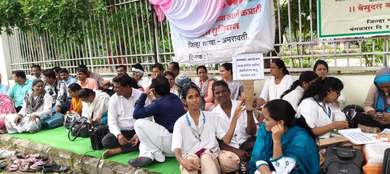 आरोग्यसेवेत मोठ्या प्रमाणावर एनएचएमअंतर्गत कंत्राटी डॉक्टर, तसेच कर्मचारी कार्यरत आहेत. वर्ष २००५ पासून कार्यरत असलेल्या राष्ट्रीय आरोग्य अभियानांतर्गत कंत्राटी कर्मचारी यांच्या विविध मागण्यांसंदर्भात १४ मार्च २०२४ रोजी शासनाने दहा वर्षापेक्षा जास्त सेवा देणाऱ्या कंत्राटी कर्मचाऱ्यांना आरोग्यसेवेत नियमित करण्यासंदर्भातील शासन निर्णय जारी केला; परंतु त्या शासन निर्णयाची प्रभावीपणे अंमलबजावणी सुरू झालेली नाही. तसेच वार्षिक वेतनवाढ, विमासुरक्षा, एचआर पॉलिसी अशा विविध मागण्यांसाठी आझाद मैदानावर आंदोलन केले होते; परंतु तरीही मागण्या मान्य न झाल्याने राष्ट्रीय आरोग्य अभियान एकत्रीकरण समितीच्या वतीने १९ ऑगस्टपासून बेमुदत संप सुरूच आहे. या आंदोलनामध्ये अशोक कोठारी, अंकुश मानकर, मनीष पिजरकर, महेंद्र अंबुलकर, रवी चंद्रे, राहुल खानपासोडे, नरेंद्र नरवाडे, शुभम कडू, अभिजीत जिरापुरे, पवन खेडकर, सुशांत बडगे, पूनम सुतार, लीना भगत, मयुरी देवकाते, सुनीता पाठक, कोमल वानखडे, जयश्री गोडबोले आदींसह शेकडो कर्मचारी सहभाग झाले आहेत. दरम्यान हरतालिके निमित्त मंगळवारी कंत्राटी महिला कर्मचारी आंदोलन स्थळीच पुजा मांडणार आहेत.